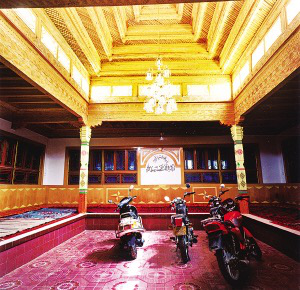 和田的“阿以旺”民居。和田地处塔克拉玛干沙漠的南部,冬冷夏热,干旱少雨风又大,蒸发量是降雨量的几十倍。为了适应气候,维吾尔人创造了平顶土房,房内居室分冬室和夏室两部分。在维语中,“夏室”又称“阿以旺”,建筑前面的外廊,其地面高出院落地面近一米,形如土炕,铺毡毯,是每年5 ~ 11月份日常生活、待客的主要场所,晚间铺被褥即可睡觉。设天窗侧向采光